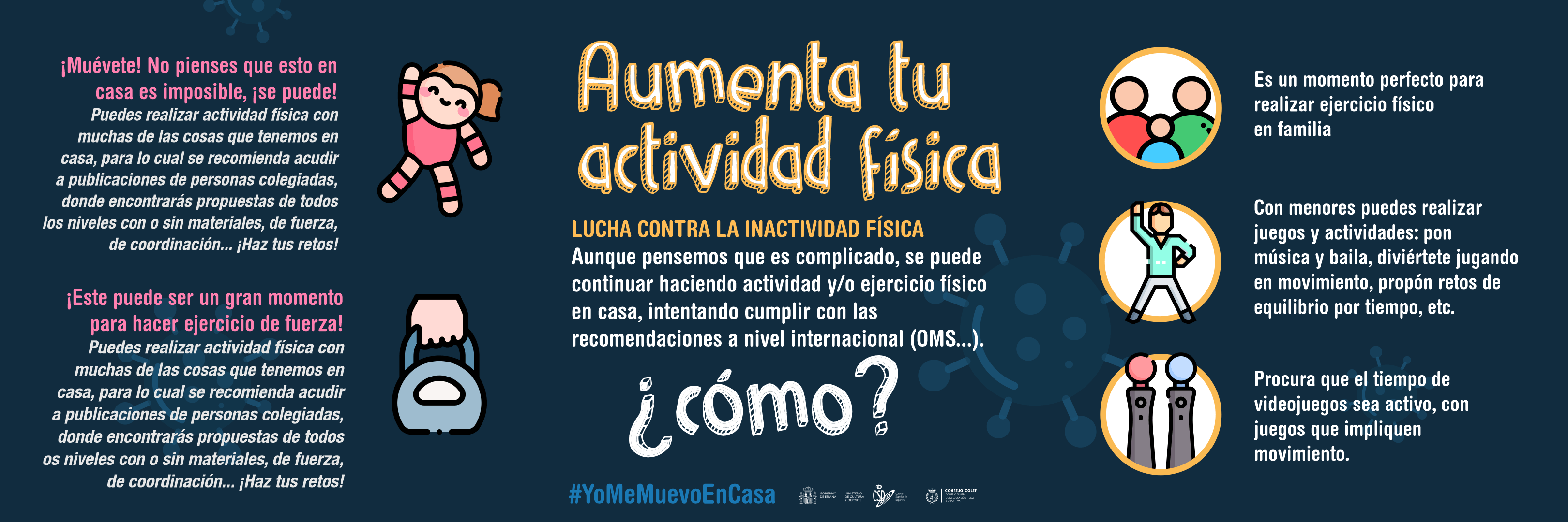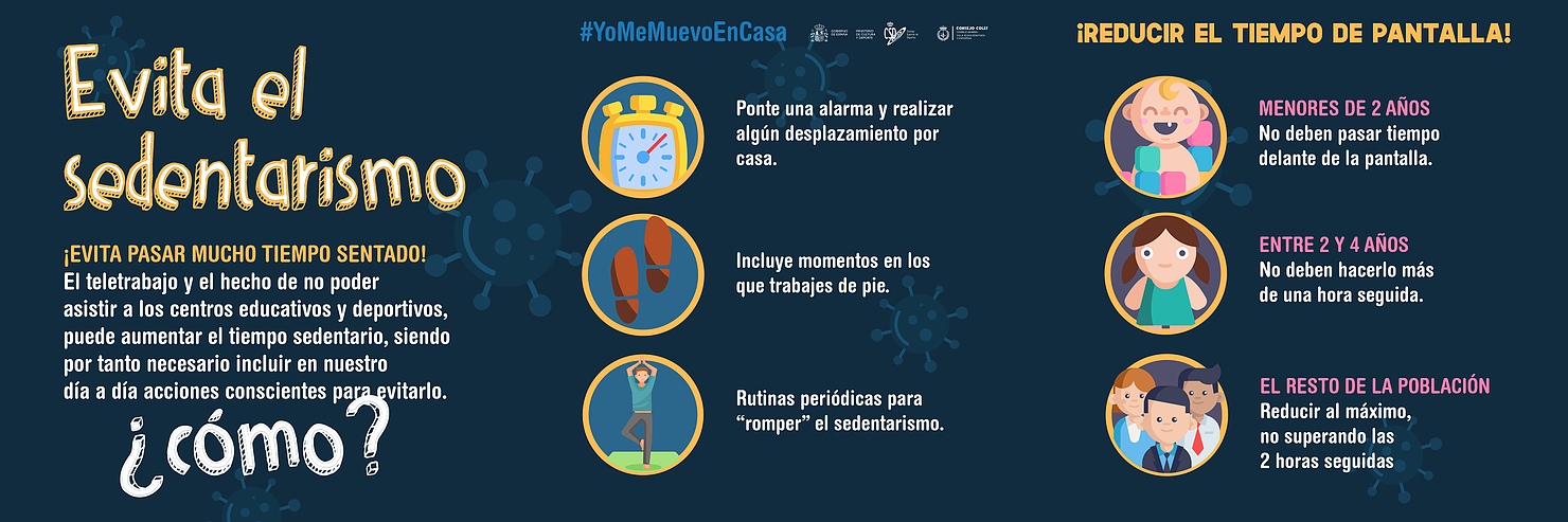 En la página web del consejo general de la educación física y deportiva encontrarás diferentes iniciativas para continuar moviendo durante la cuarentena. #YoMeMuevoEnCasa o #YoEntrenoEnCasa son algunas de sus iniciativas. Consejos para evitar el sedentario, ejercicios y mucho más en su web